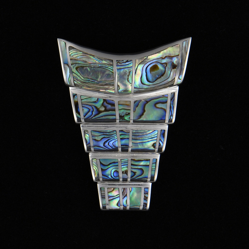 Quite large pendant with shell set in solid silver. Best with a Double Cord to match. This is a unique one of a kind pendant. Length 7.cm, Width at the widest point 5cm.